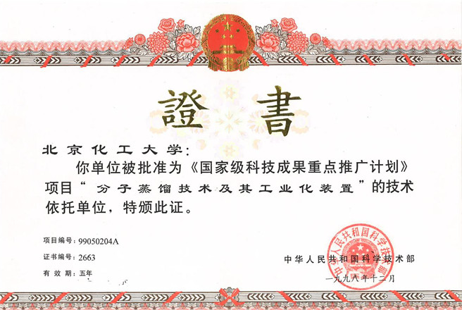 1998年“分子蒸馏技术及工业化装置 ”被国家科技部列为 “ *********科技成果重点推广计划 ”项目