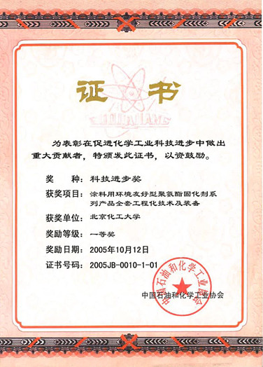 2005年“涂料用环境友好型聚氨酯固化剂系列产品全套工程化技术及装备 ”荣获中国石油和化学工业科学技术奖一等奖