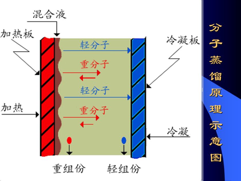 分子蒸馏是一种特殊的液--液分离技术,它不同于传统蒸馏依靠沸点差分离原理,而是靠不同物质分子运动平均自由程的差别实现分离。这里,分子运动自由程是指一个分子相邻两次碰撞之间所走的路程。 当液体混合物沿加热板流动并被加热,轻、重分子会逸出液面而进入气相,由于轻、重分子的自由程不同,因此,不同物质的分子从液面逸出后移动距离不同,若能恰当地设置一块冷凝板,则轻分子达到冷凝板被冷凝排出,而重分子达不到冷凝板沿混合液排出。这样,达到物质分离的目的。